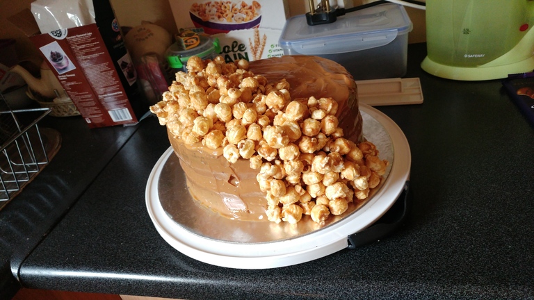 2 Layer Chocolate cake with Caramel Icing and finished with Caramel Popcorn