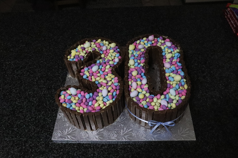 2 Layer Chocolate cake, A4 sized letters, Caramel Buttercream Icing with Kit Kat and Speckled egg finish